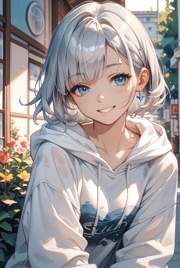 例:「桜の木の下で笑う女の子、春、アニメ風」