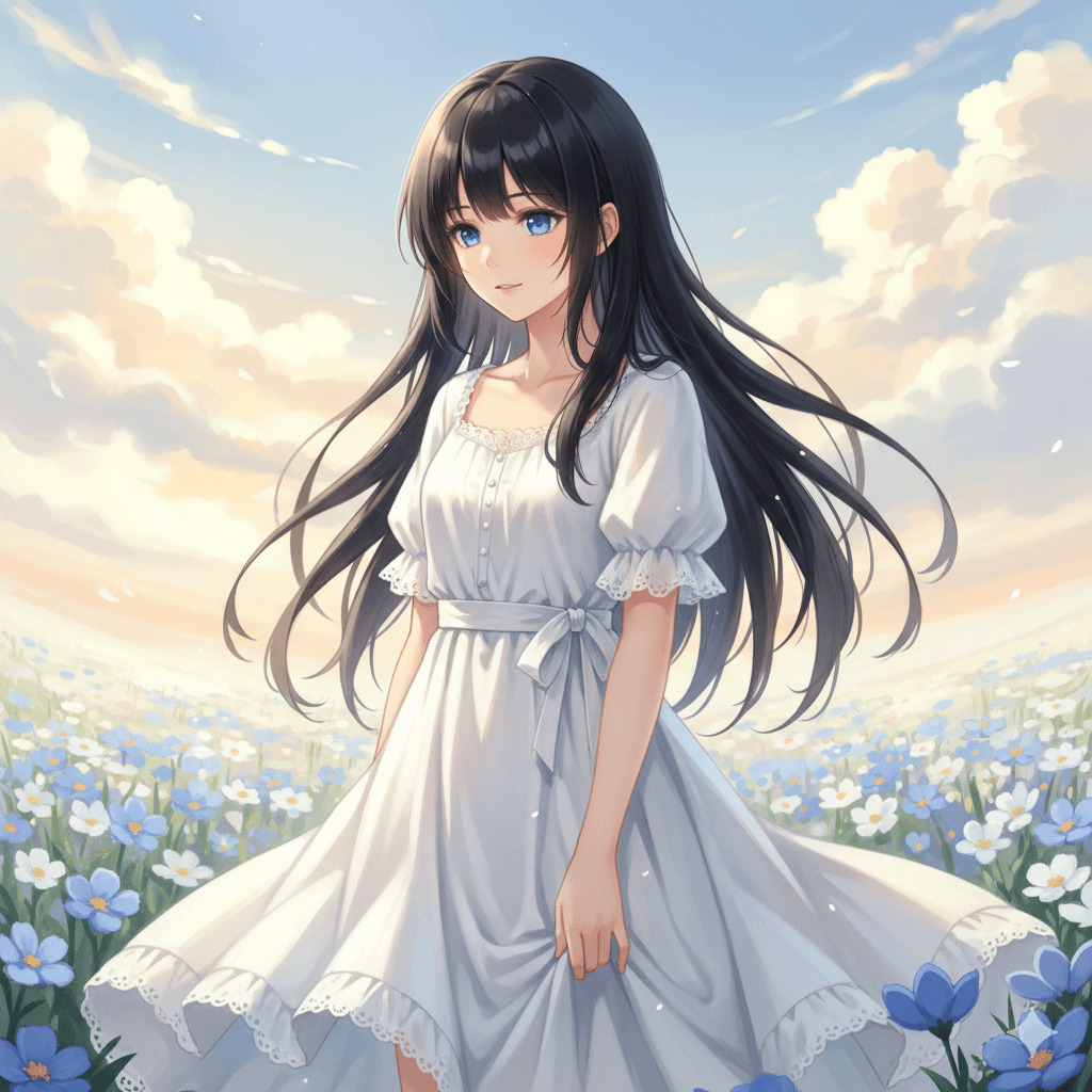 - OK例: 「1人の女の子、長い黒髪、青い瞳、白いワンピース」