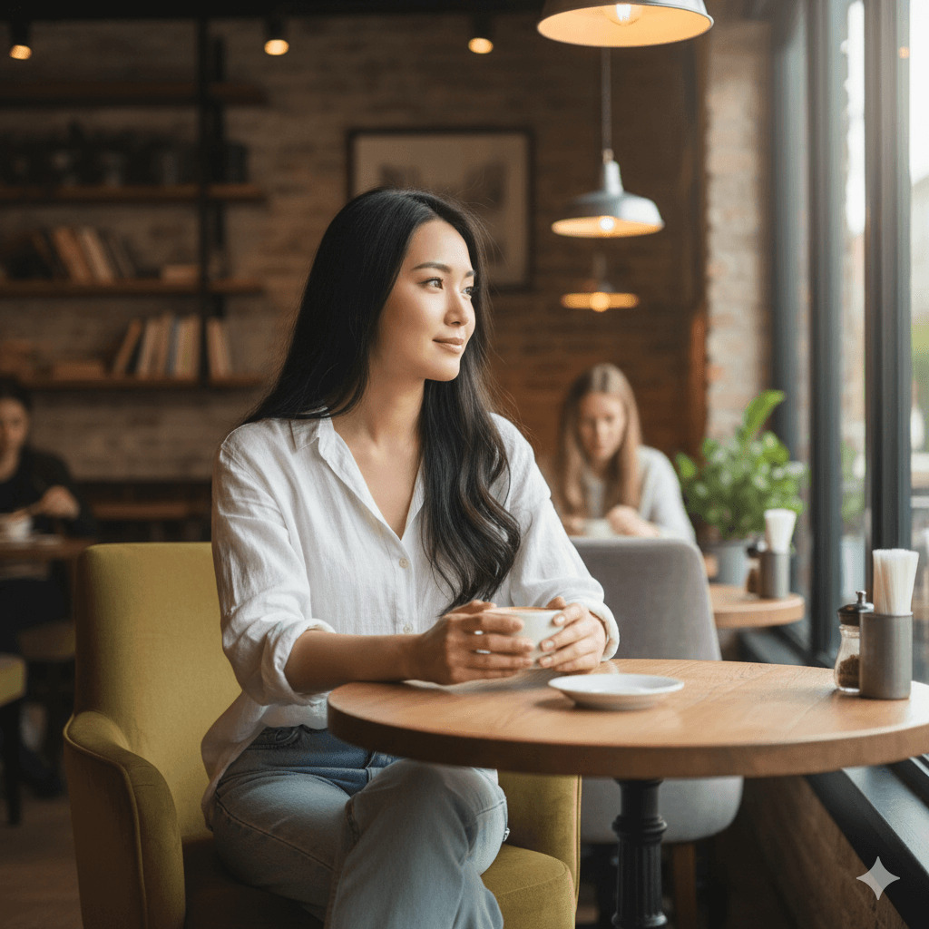 (美しい日本人女性、長い黒髪、ナチュラルメイク、白いシャツ、カフェに座っている、暖かい照明、写実的、8K、高品質)