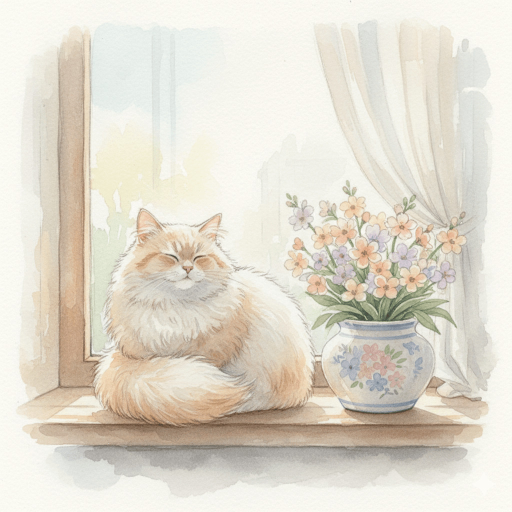 (かわいい猫、ふわふわ、窓際に座っている、花瓶、柔らかい色、水彩画風、パステル、優しい照明)