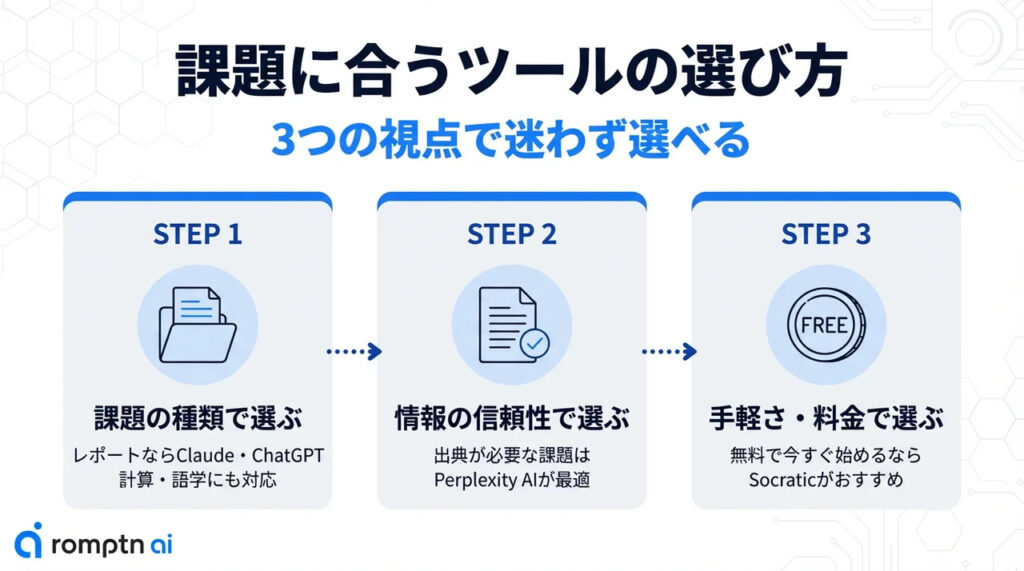 AIツールにはそれぞれ得意分野があるため、課題の種類に合わせて使い分けることが、質の高い成果物を効率よく仕上げるコツです。ここでは、3つの視点から最適なツールを選ぶ方法を解説します。