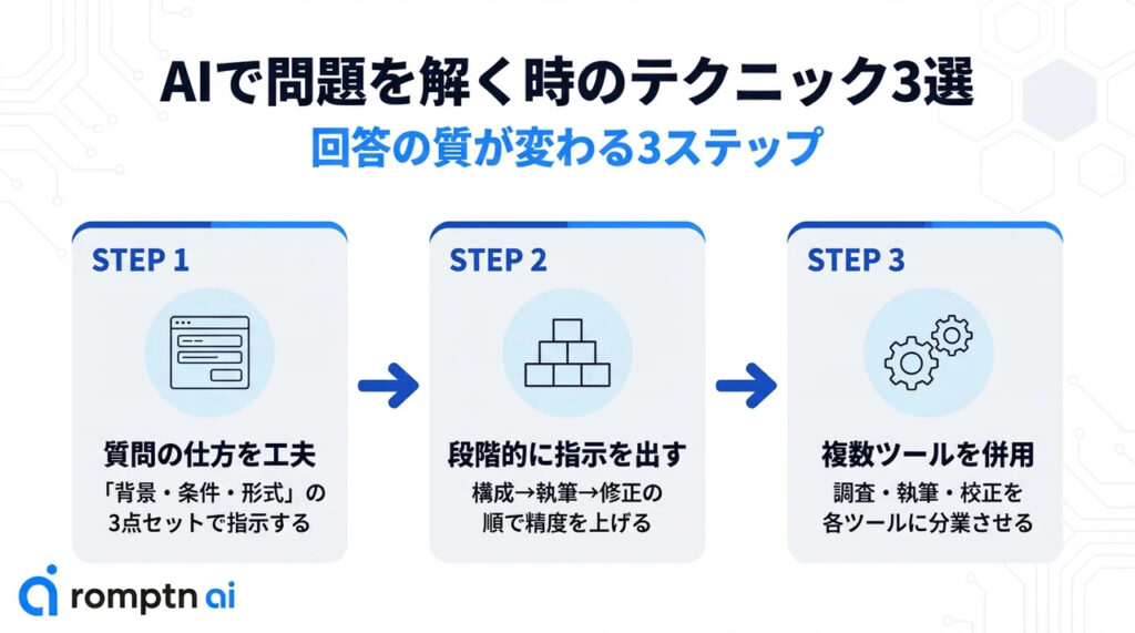 AIツールはそのまま使っても便利ですが、少しの工夫で回答の質が大きく変わります。ここでは、課題の精度とスピードを上げる3つのテクニックを紹介します。