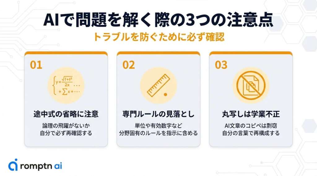 AIの解答は丸写し厳禁!必ず自分で論理や計算過程の確認・修正が必要