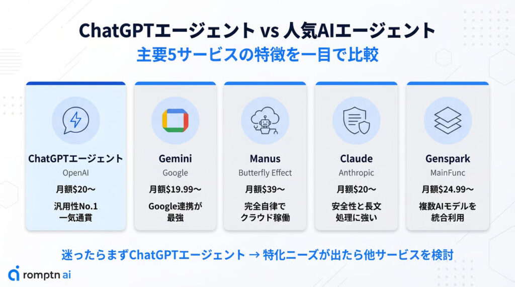 初めてならまずChatGPTエージェントから始めてみて、もし特定の専門的なニーズが出てきたら、他のAIエージェントも検討するというのが良いアプローチです。主要な業務や目的に合わせて、最適なAIエージェントを選択することが重要です。