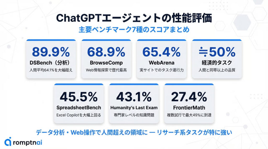 ChatGPTエージェントは、ただ「動ける」だけでなく、「賢さ」も十分に評価されています。OpenAIが行った様々なテスト(ベンチマークテストと呼びます)で、その実力が証明されています。