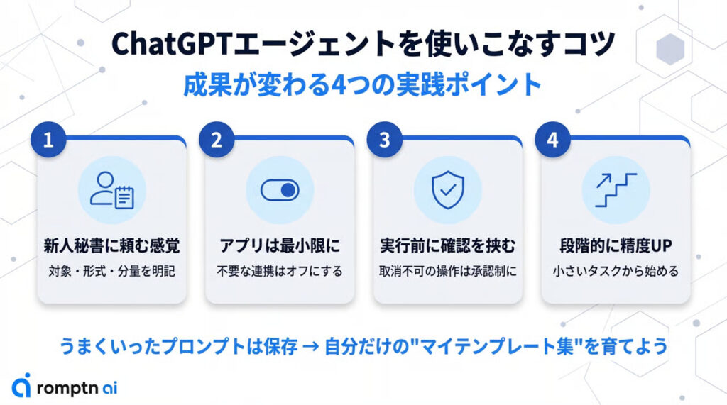ChatGPTエージェントは便利な反面、使い方次第で成果に大きな差が出ます。ここでは実際に使い込んで分かった、エージェントの性能を最大限引き出すための4つのコツを紹介します。