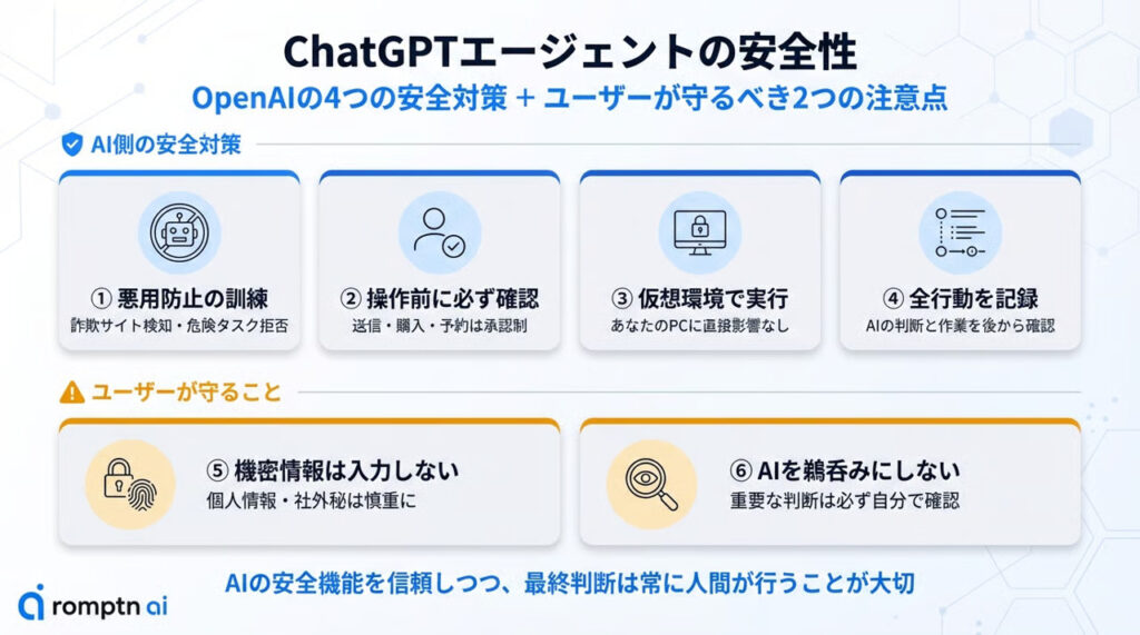 AIが代わりに色々な作業をしてくれるのは便利ですが、「本当に安全なの?」と心配になる方もいるかもしれませんね。OpenAIは、ChatGPTエージェントを安心して使えるように、様々な工夫をしています。