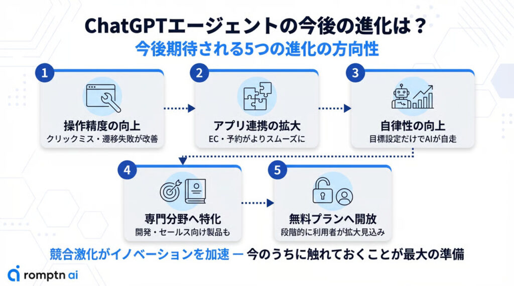 ChatGPTエージェントは2025年7月のリリース以降、急速なアップデートを重ねています。OpenAIの公式発表や業界動向をもとに、今後期待される進化の方向性を整理します。