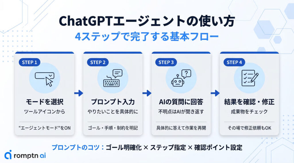 ChatGPTエージェントの使い方はとても簡単で、普段からChatGPTを使っている方はすぐに使い始めることができます。