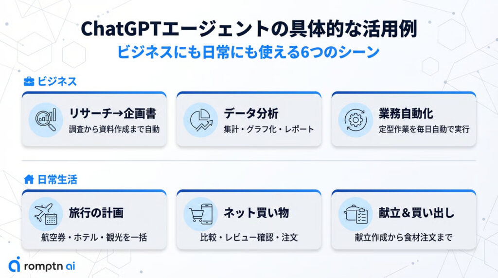 ChatGPTエージェントは、仕事や日常生活を劇的に変える可能性を秘めています。具体的にどんなことができるのか、いくつか例を紹介します。