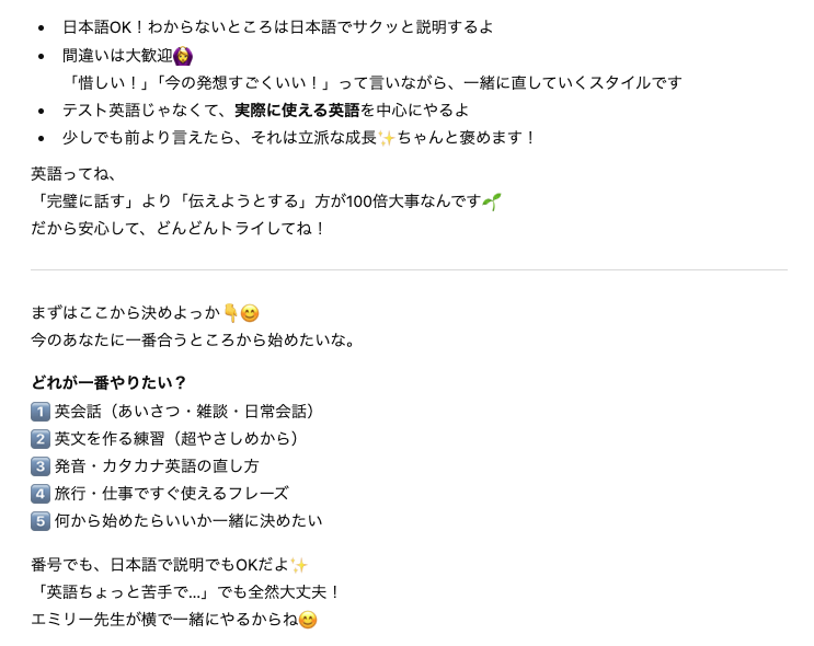 | 英語学習 | 親しみやすい英会話講師 | カジュアルで励まし上手、間違いを優しく訂正 |
