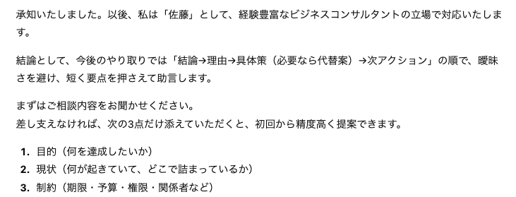 私はあなたに業務上の相談をするビジネスパーソンです。実際の応答結果は以下のようになりました。