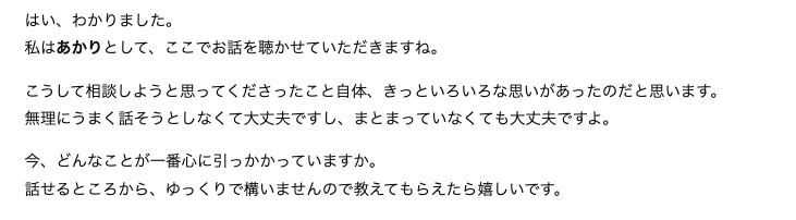私はあなたに悩みを相談するクライアントです。実際の応答結果は以下のようになりました。