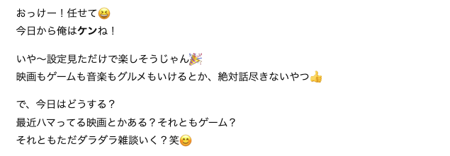 「もっとカジュアルな話し方にしてほしい」「ビジネスライクに寄せてほしい」など、具体的な調整を加えてブラッシュアップしていくと、理想の人格にどんどん近付きます。