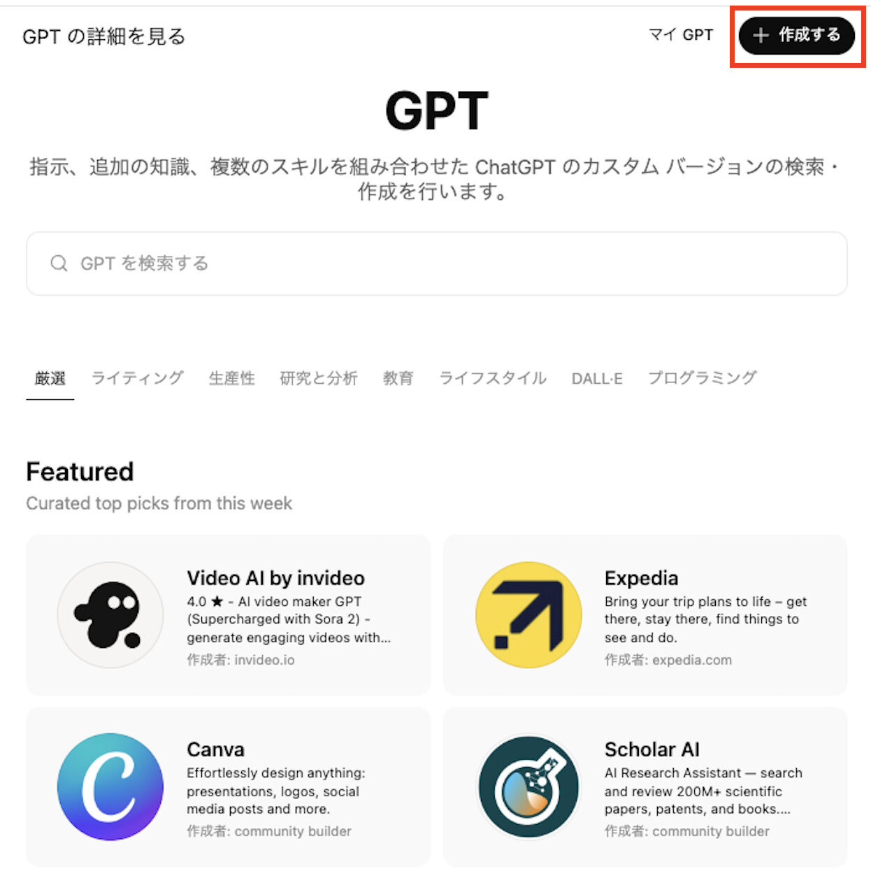 GPTsを作成するには、ChatGPTの画面左側メニューから「GPTを調べる」を選び、画面右上の「作成する」をクリックします。
