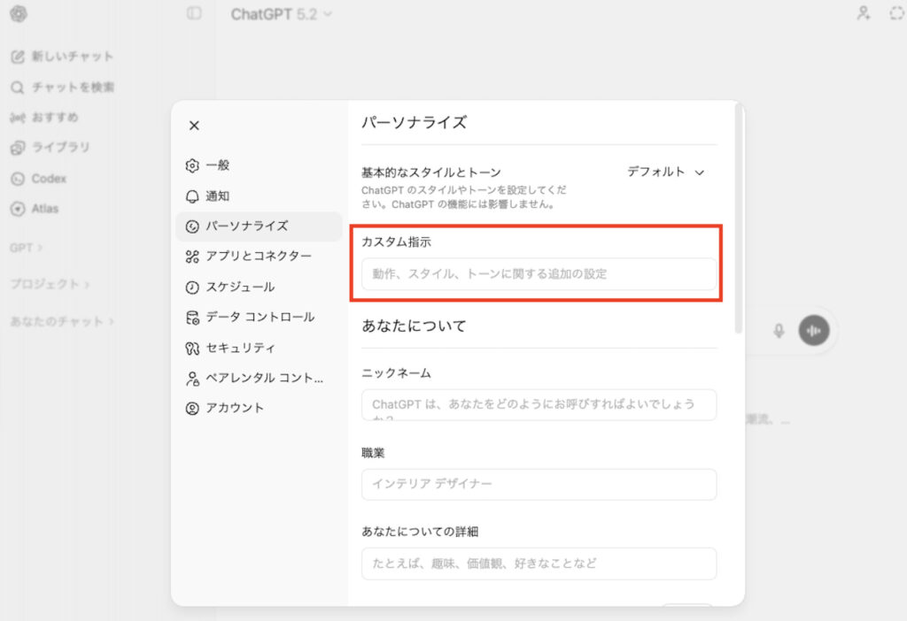 毎日同じ人格でChatGPTを使いたい方には、カスタム指示の活用がおすすめです。