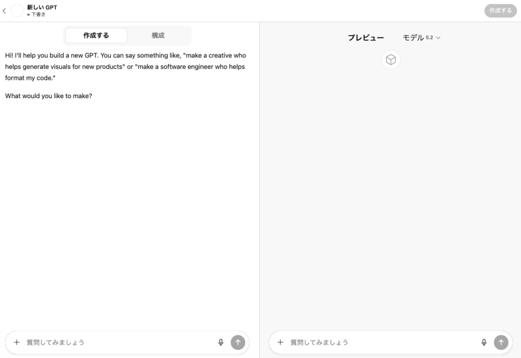 作成画面では対話形式で設定を進めることができ、名前、説明、指示内容、会話の開始メッセージなどを入力していきます。プログラミングの知識は一切不要で、日本語で人格設定を書くだけで完成します。