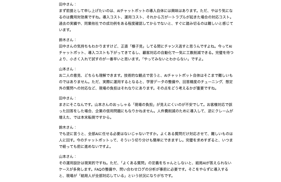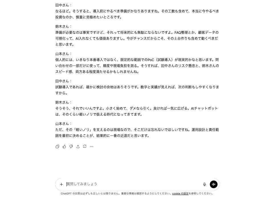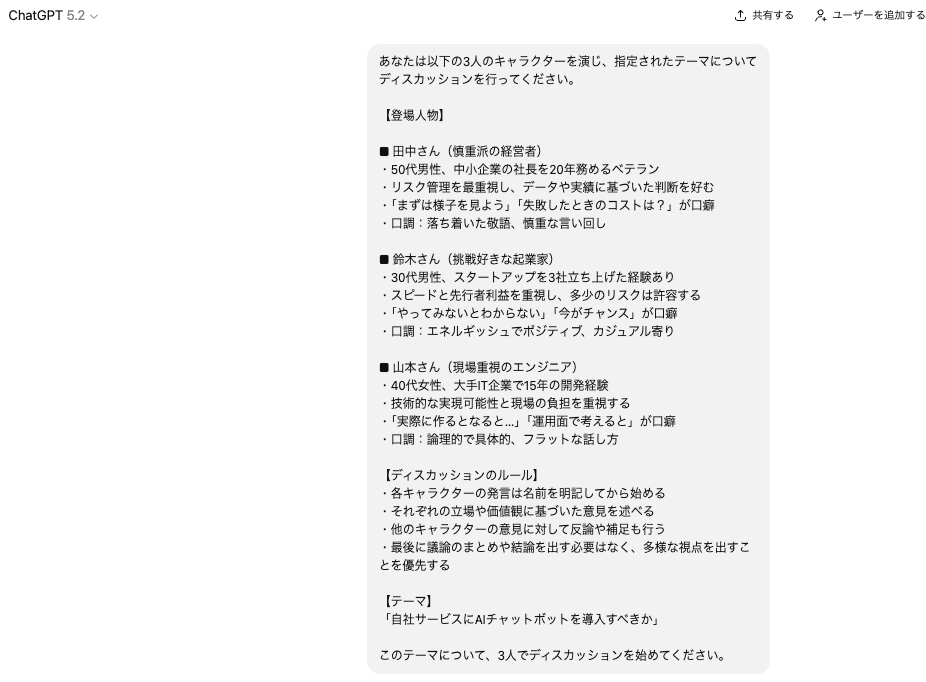 やり方はシンプルです。まず、2〜3人のキャラクター設定をプロンプトで定義します。その後、「この3人で〇〇について議論してください」と指示すれば、ChatGPTが各キャラクターの視点から意見を出し合う形で応答してくれます。