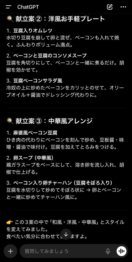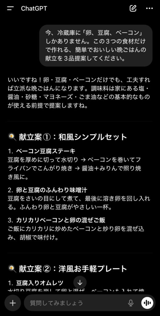 献立を考えるのが面倒な時も、ChatGPTは頼れる相談相手です。条件を具体的に伝えることで、実用的なレシピを提案してくれます。