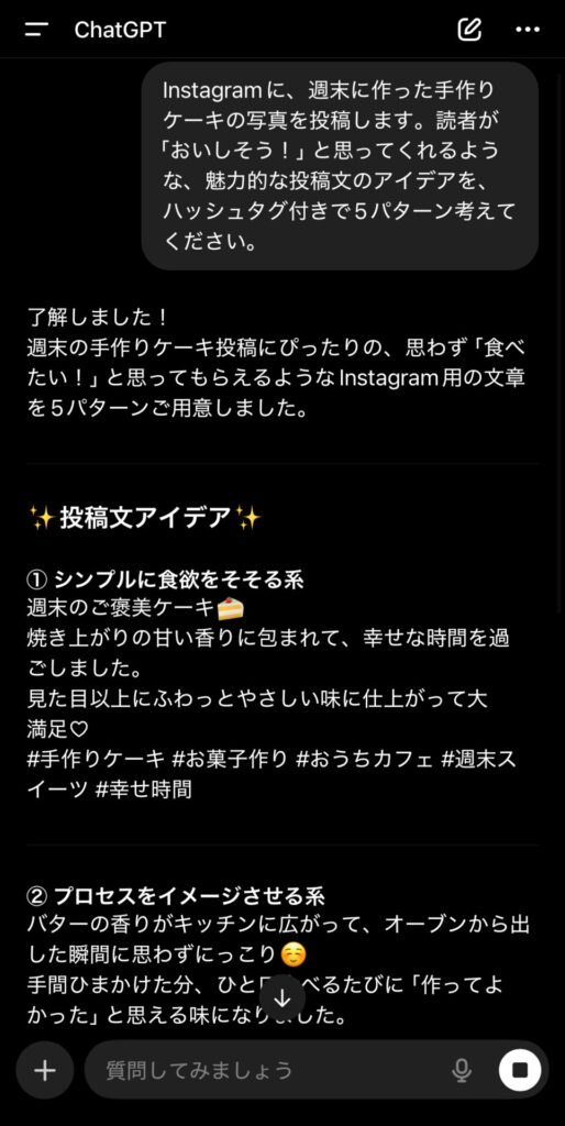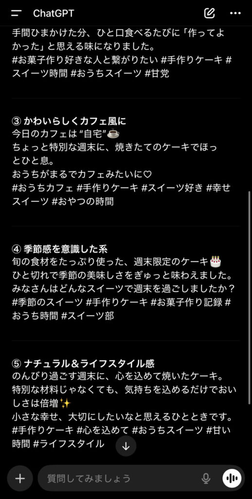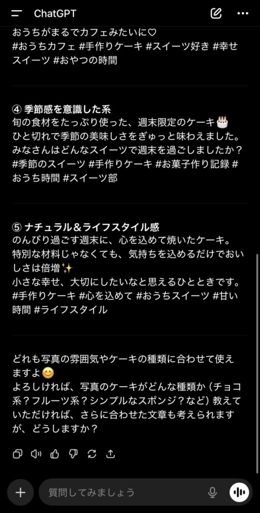 Instagramに、週末に作った手作りケーキの写真を投稿します。読者が「おいしそう!」と思ってくれるような、魅力的な投稿文のアイデアを、ハッシュタグ付きで5パターン考えてください。【回答例】