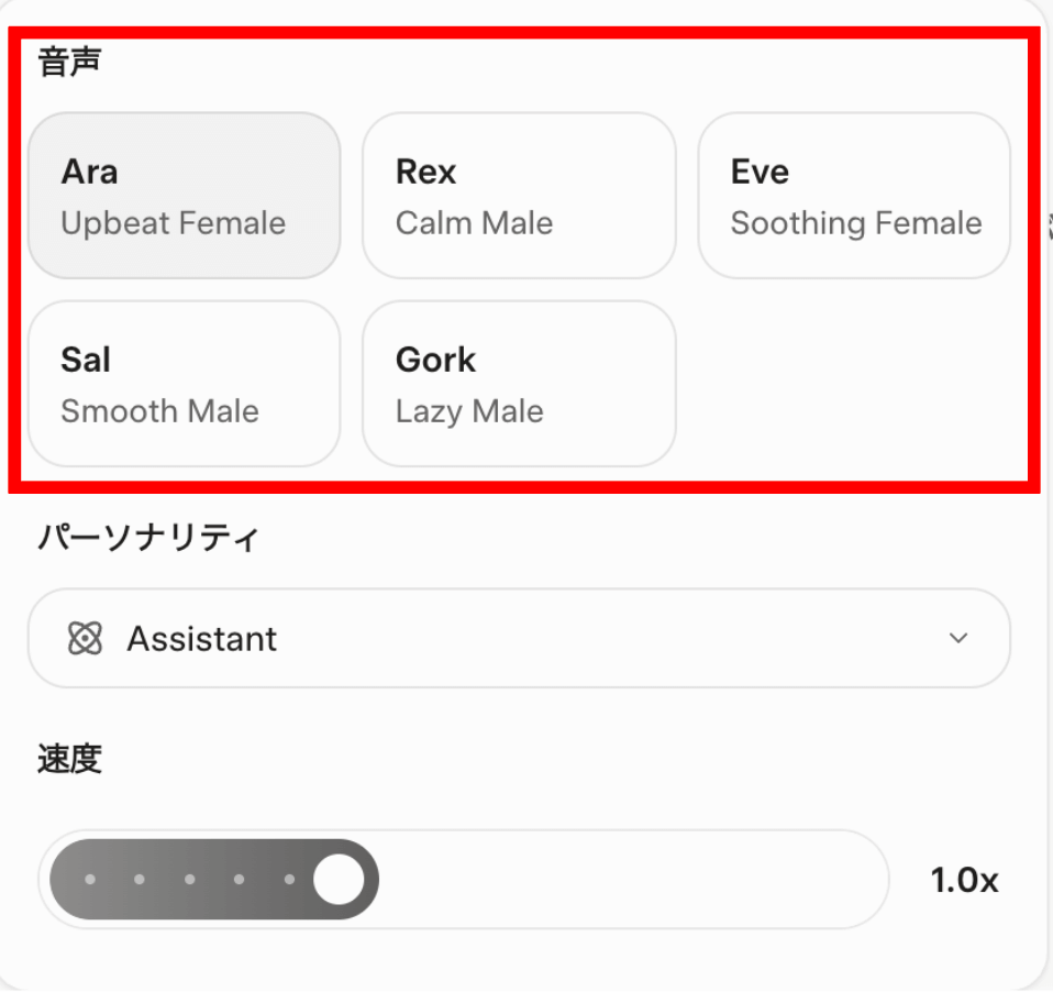 また、パーソナリティ(個性)が選択でき、「Assistant」や「Therapist」など利用場面によって変更することも可能です。