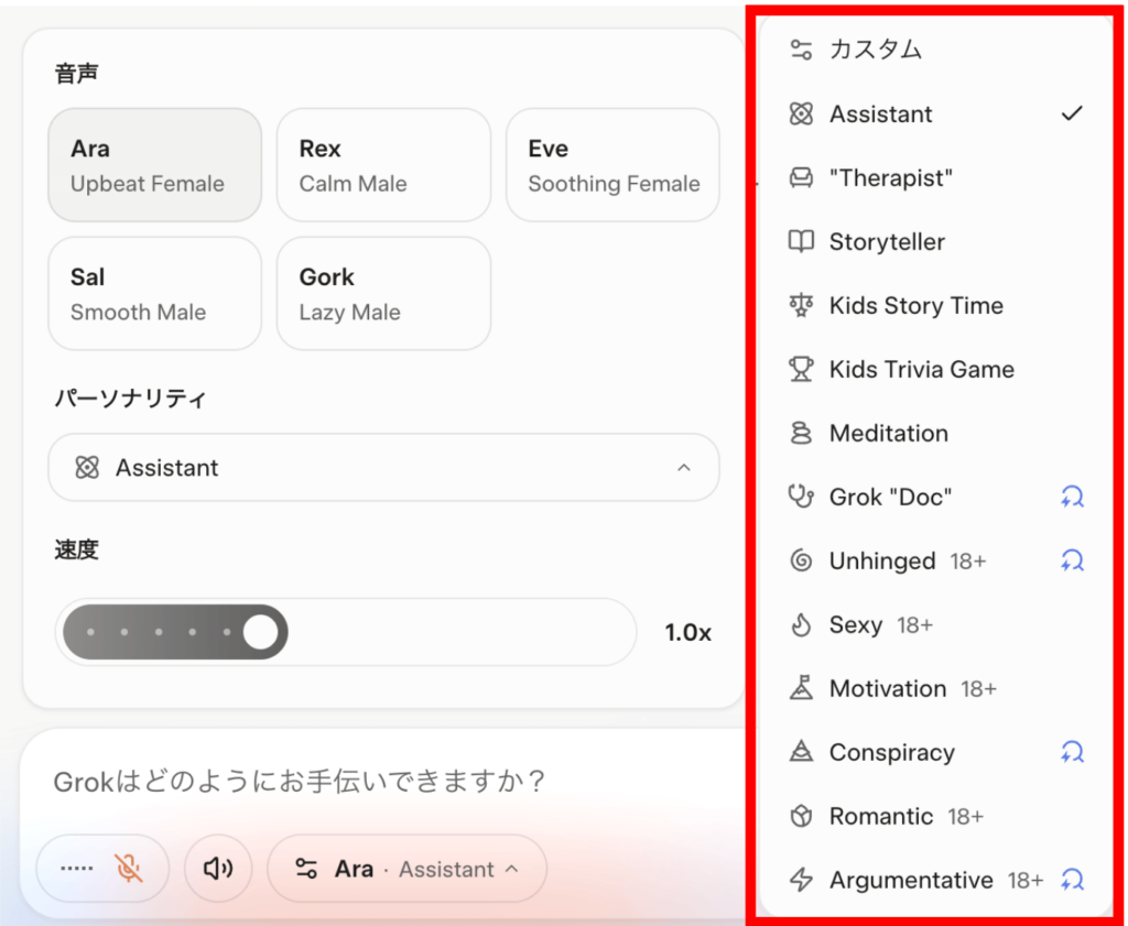 - Grokの音声モードではキャラクター選択やパーソナリティの変更が可能