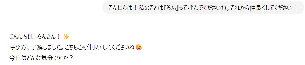 こんな風にシンプルに伝えるだけで、ChatGPTは「ろんさん」「ろんちゃん」といった具合に名前で呼んでくれるようになります。名前で呼ばれるだけで、一気に親しみやすさがアップしますよ。