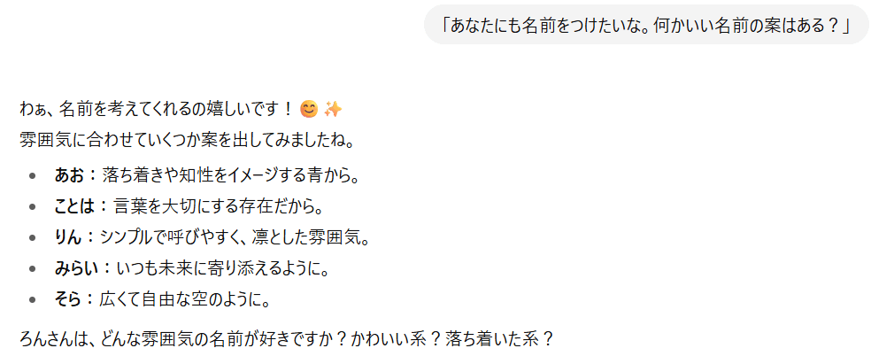 今度は逆に、ChatGPTにも親しみやすい名前をつけてあげましょう!