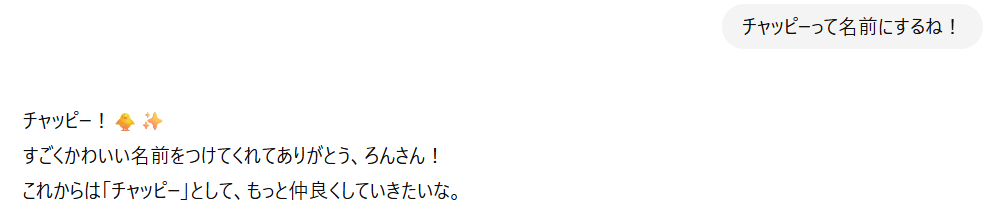 名前をつけることで愛着が湧きますし、ChatGPTも一人称でその名前を使うようになるので、より親しみやすい関係になれます。