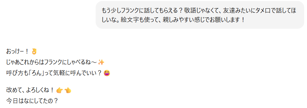 「もう少しフランクに話してもらえる?敬語じゃなくて、友達みたいにタメ口で話してほしいな。絵文字も使って、親しみやすい感じでお願いします!」
