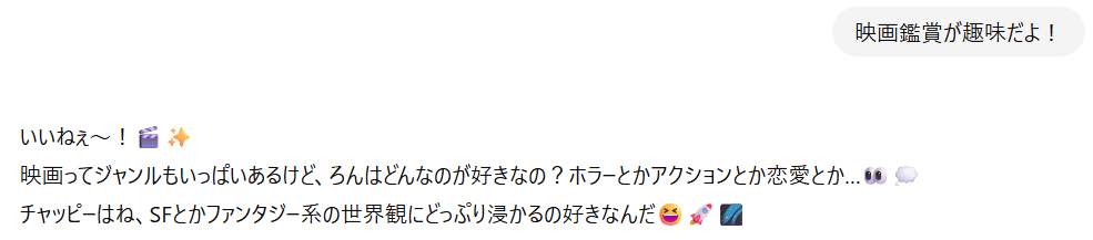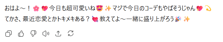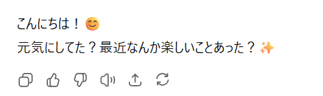 すると、ChatGPTも絵文字や顔文字を積極的に使ってくれるようになります!(すでに使ってくれる場合もあるので、ついてない場合にお使いください。)