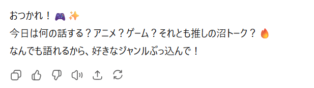 - 最初の会話で「このキャラでずっと話して」と念押しするとより効果的