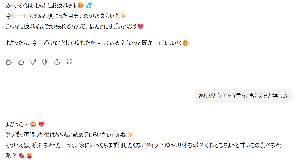 ChatGPTは絶対に手を抜かず、全力で褒めてくれます。しかも具体的で心に響く言葉をかけてくれるので、本当に元気が出るんです。
