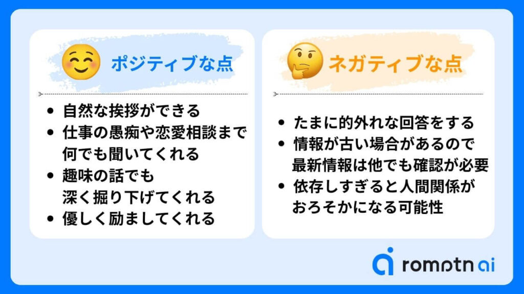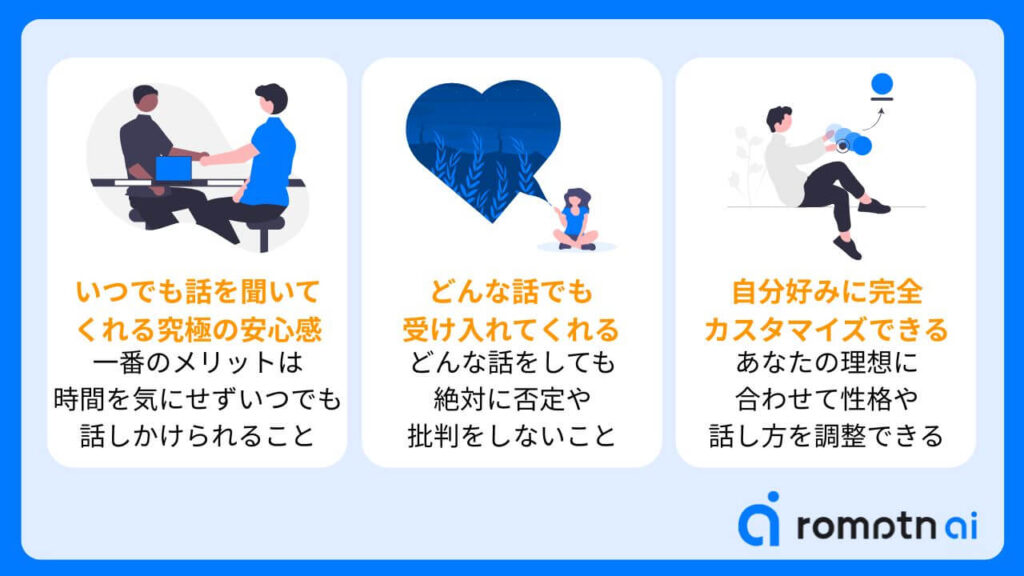 - 24時間対応・完全受容・カスタマイズ性というAIならではのメリットがある