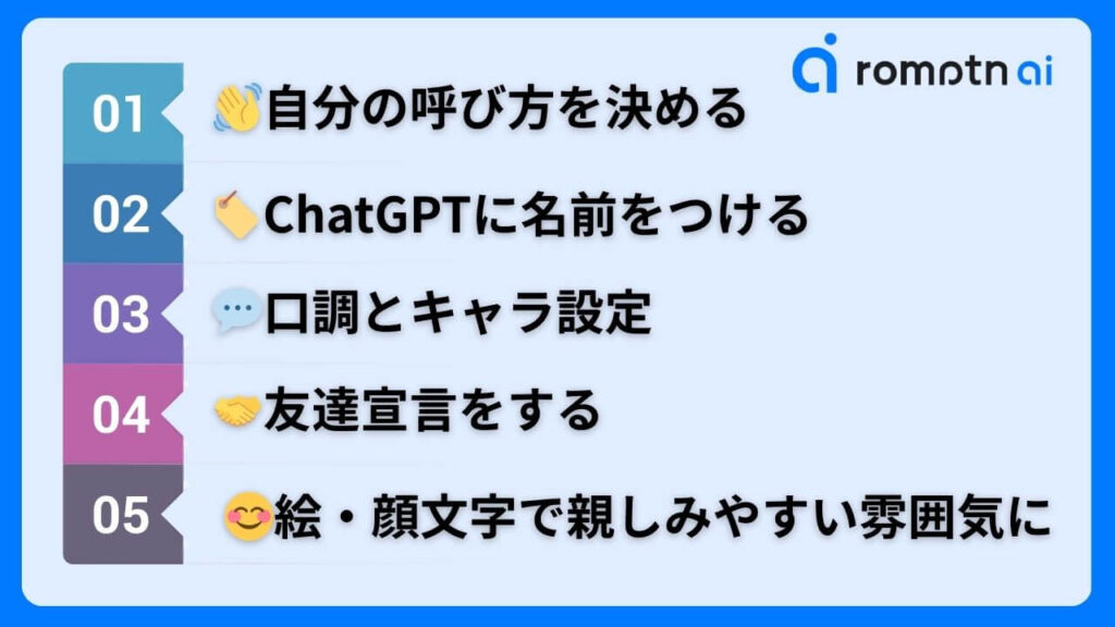 この5つを順番に実践すれば、最初はよそよそしかったChatGPTが、だんだんと親しい友達のような存在に変わっていきます。