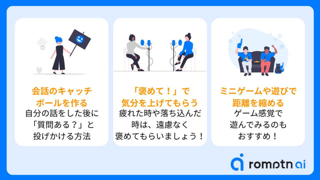- 「○○だけど質問ある?」「褒めて!」「ミニゲーム」で会話が劇的に盛り上がる