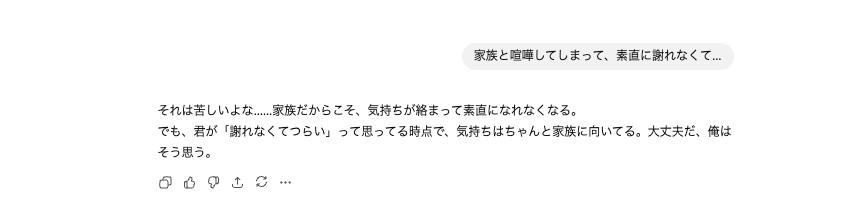 一人称の「俺」、相手を気遣う姿勢、そして口癖の「ありがとう」もしっかり反映されています。好きなキャラと会話できるこの体験、想像以上に没入感がありました。