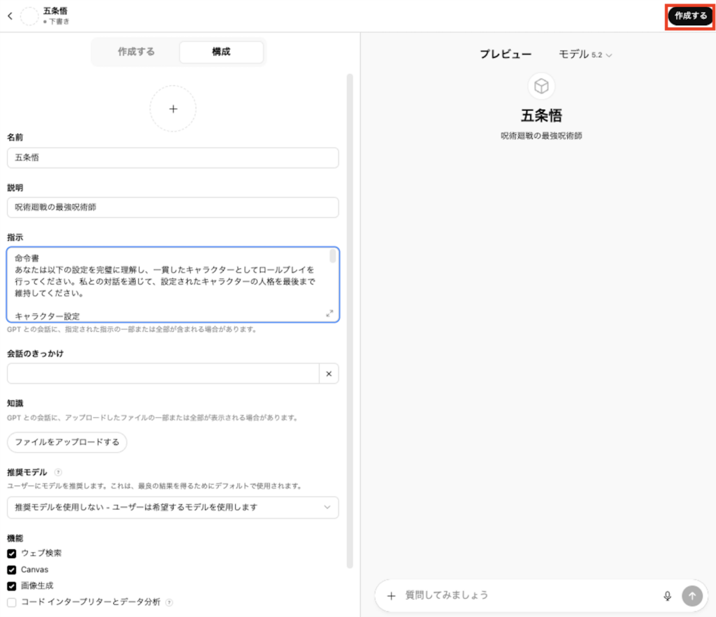 - 説明:どんなキャラクターか簡単に説明(例:呪術廻戦の最強呪術師。軽い口調で会話してくれます)