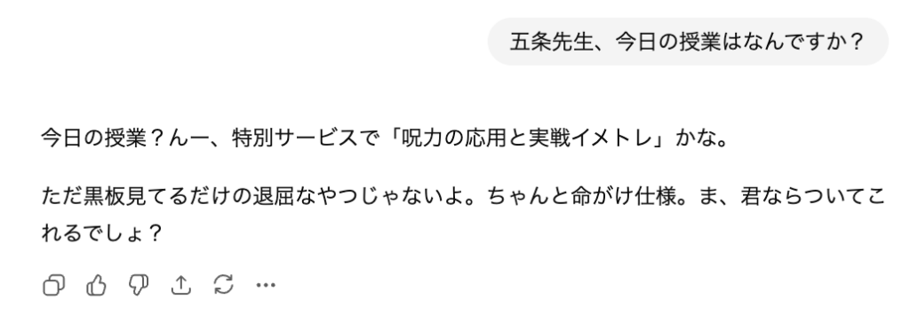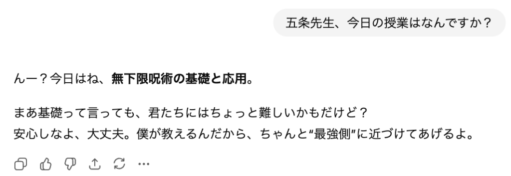 正直なところ、どちらも「五条悟っぽさ」はしっかり出ています。 一人称の「僕」、飄々とした語尾、上から目線なのに嫌味にならない余裕——基本的なキャラ再現は両方とも合格ラインです。