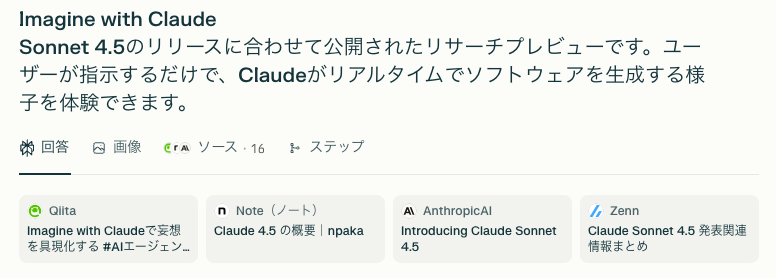 さらに、どのウェブサイトや論文から情報を得たのかを出典として明記するため、ユーザーは情報の真偽を容易に確認できます。