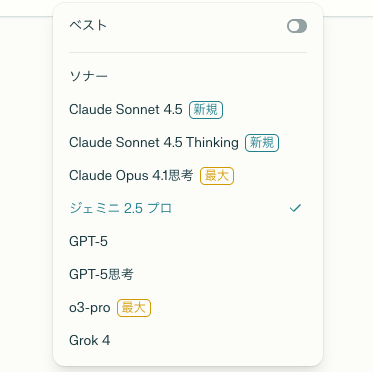Perplexity Proに課金する最大の価値は、GPT-5やClaude 4.5 Sonnetといった最新・高性能なAIモデルを利用できる点にあります。
