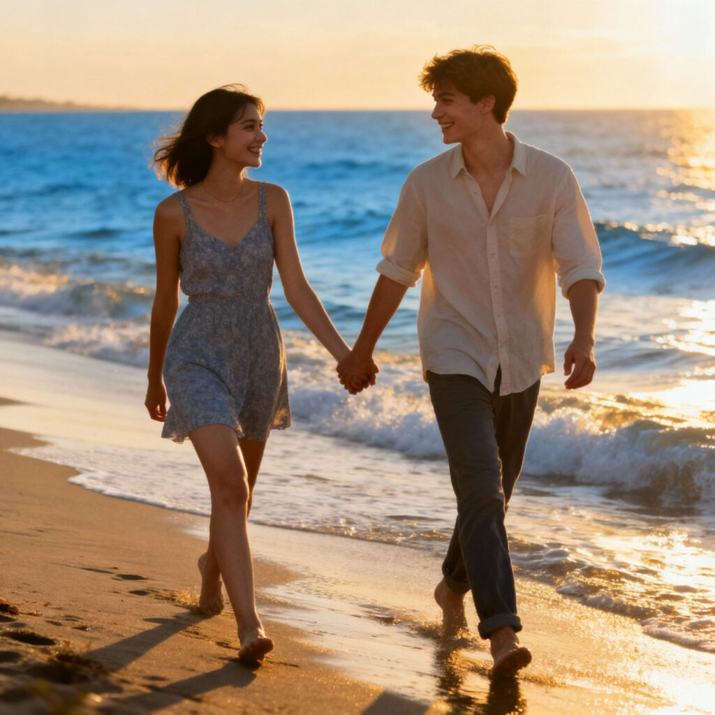 20代のカップルが海辺を歩く画像を作成して