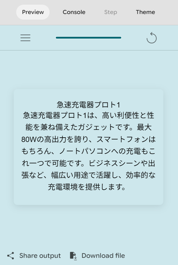 このようにAIが組み込まれたアプリを簡単に生成することが可能です。一回プロンプトを入力するだけでバグもなく、しっかりと希望通りに動くアプリが生成されました。