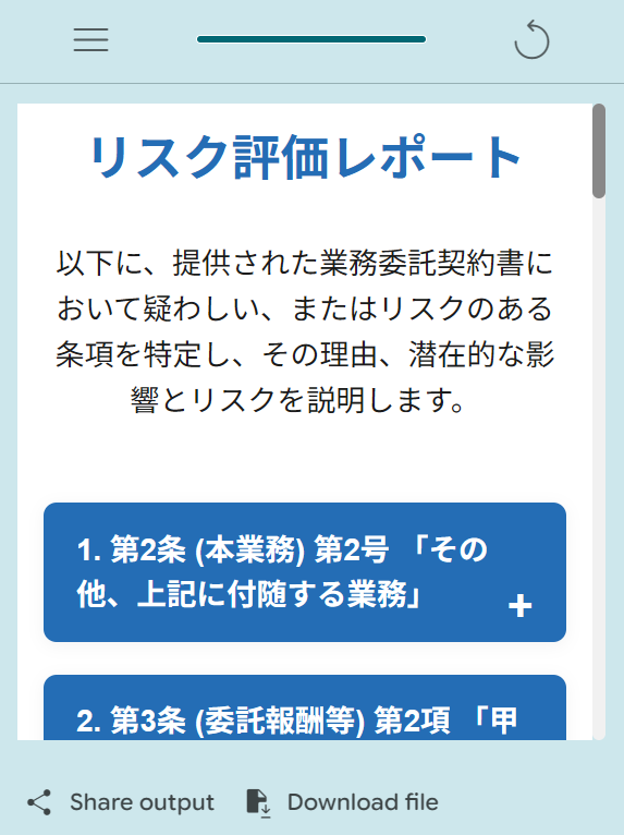 契約書をアップロードもしくはコピペするとその内容で怪しい箇所やリスクがありそうな箇所をピックアップしてくれる契約時に便利なアプリを作りたいです。