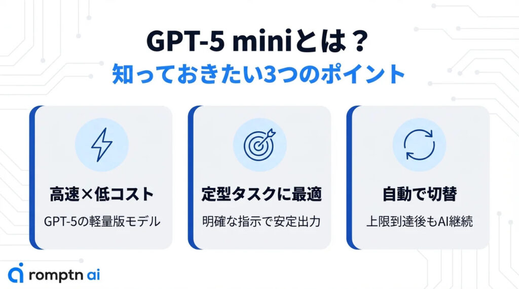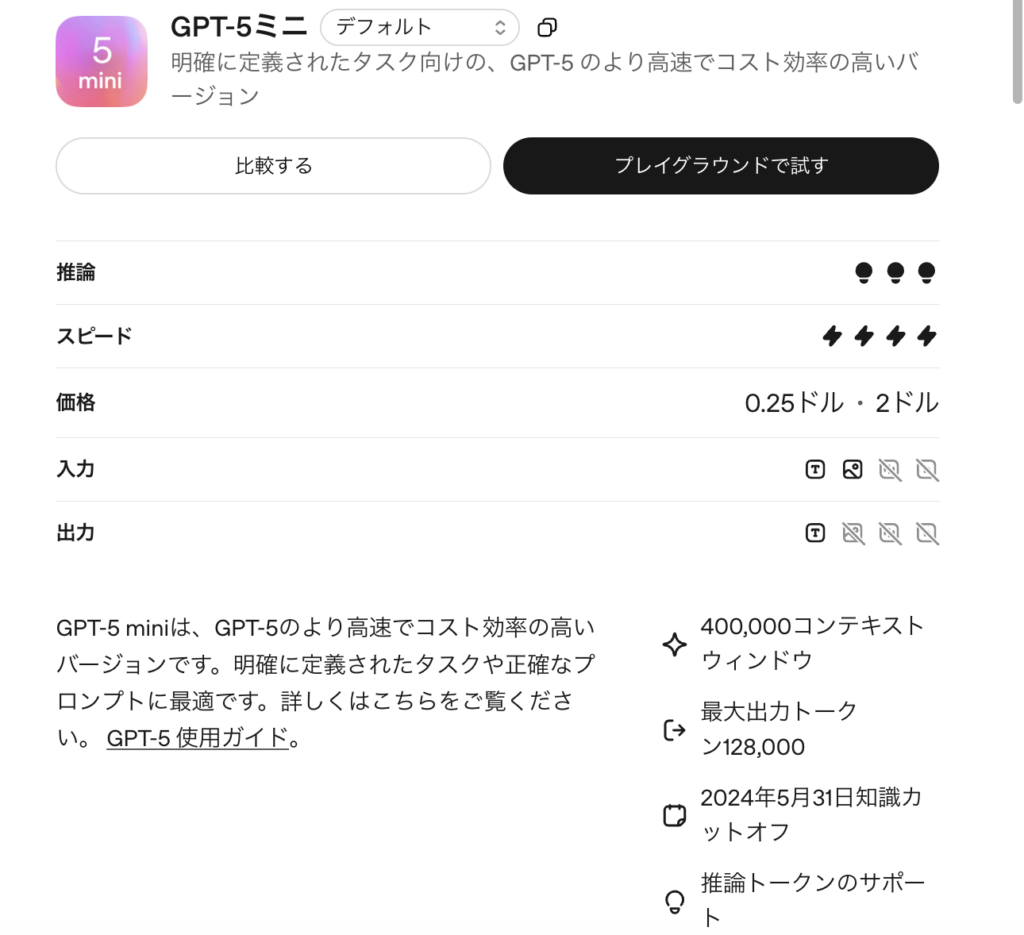 • GPT-5 miniは高速・低コストで、定型タスクの処理に優れた軽量版AIモデル