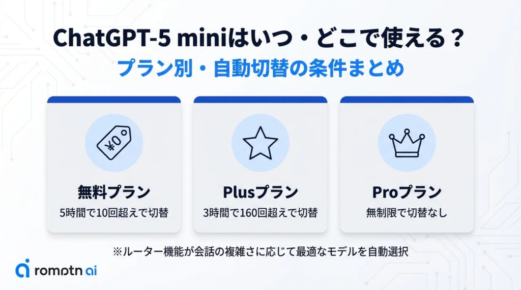 また、ChatGPTでGPT-5を利用している際、プランごとの利用制限に達すると、自動的にこのGPT-5 miniモデルに切り替わる仕組みも導入されています。これにより、ユーザーは応答が途切れることなく、対話を継続できます。