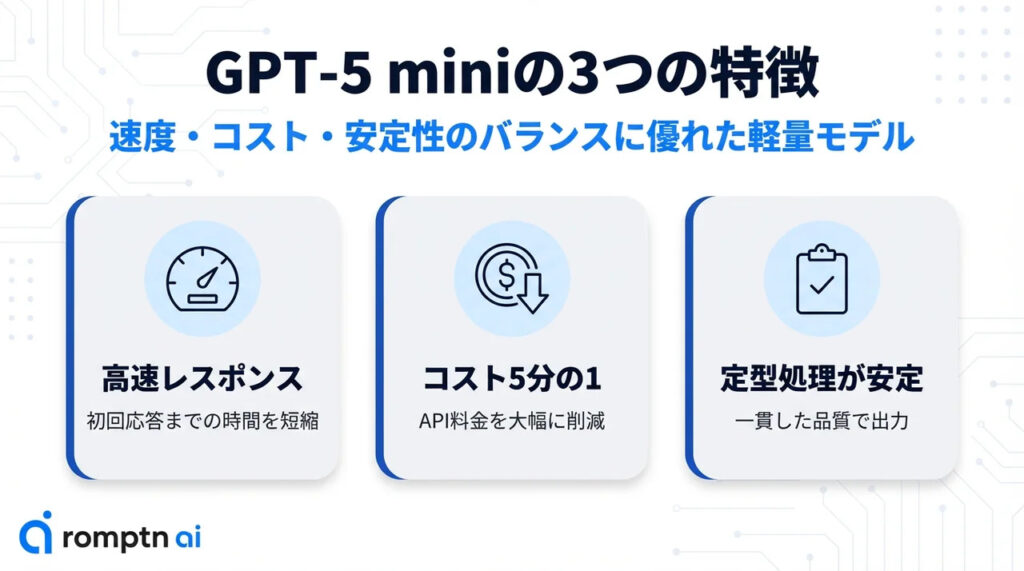GPT-5 miniで注目すべきは、その「速度」「コスト」「安定性」の3つのバランスです。ここでは、GPT-5 miniが持つ3つの特徴を詳しく解説します。
