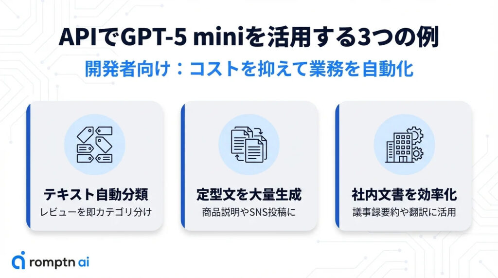 GPT-5 miniの「高速」「低コスト」「安定性」という特徴は、幅広い用途で活躍が期待できます。ここでは、APIを利用した具体的な3つの活用例を紹介します。