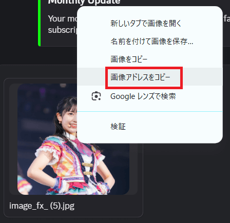 これで画像のURLがコピーされました!このURLをプロンプトに貼り付けることで、画像を参考にした生成ができるようになります。