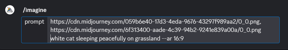 /imagine prompt https://xxx.jpg beautiful cat sleeping on grass --ar 16:9- 画像URL:参考にしたい画像のリンク